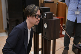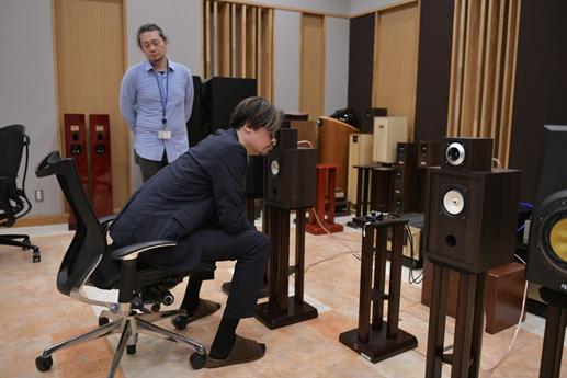 フォスター電機本社の試聴室でスピーカーの音に耳を傾ける