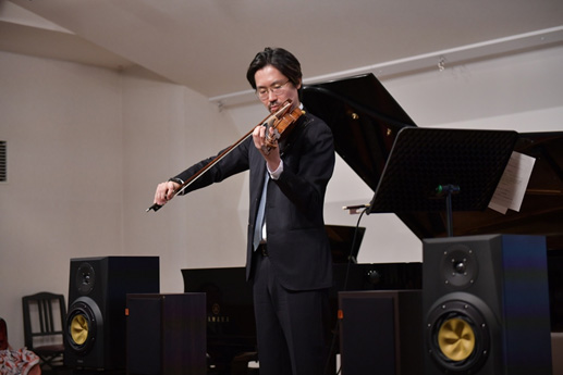 GS103A-VBは、フルレンジ・ユニットが1つで、ダイレクトな音に持ち味があります。音楽をリラックスして楽しむにはどうあるべきかを主眼に開発しました。発売以来、ありがたいことに、﨑谷さんもその一人ですが、多くの音楽ファンの皆さんから高くご評価をいただいています。今回のレクチャー・シリーズでは、100名弱のお客さんの前で、主にヴァイオリンの音を再生するということで、FOSTEX製品の中からベストだと考えて提案いたしました。特に、﨑谷さんのヴァイオリン生演奏を聴いた前後でCDを聴くので、生演奏に近い形で、録音されたヴァイオリンの音が自然に聴こえるようにと考えて選定しました。