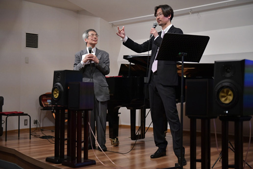 雪が降る中開催されたシリーズ第2回も、第1回に続き桐朋学園大学名誉教授西原稔氏(左)とともに