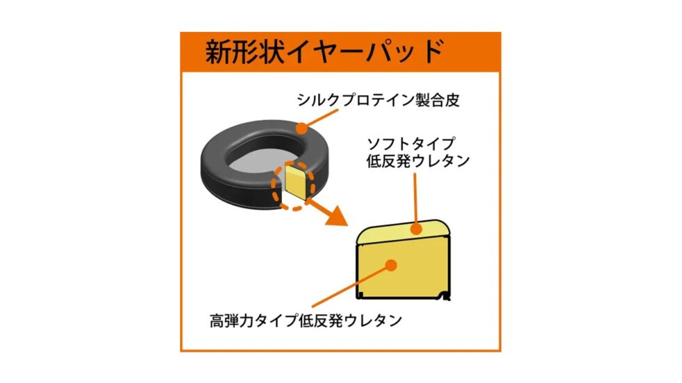 この新設計のイヤーパッドは、内部のクッション材を2層構造としており、高弾力タイプの低反発ウレタンをドライバー側、耳に当たる側には柔らかいソフトタイプの低反発ウレタンを採用。表面材は引き続き高耐久性のシルクプロテイン製合皮を用いて、長時間のリスニングでもストレスなく快適な装着性をもたらしている。