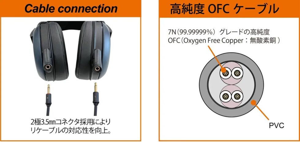 ドライバー、イヤーパッドに加え、“mk2”化でもう一つ大きな変更となったのが、ケーブル着脱部のプラグ形状を2ピン仕様から2極3.5mmミニプラグとしたことだ。3.5mmミニプラグは、他社モデルでの採用例も多く、リケーブル製品の選択肢も多いことから、より幅広い対応性を追求。付属ケーブルの導体は7Nグレードの高純度OFCを取り入れ、音質にも留意した設計としている。
