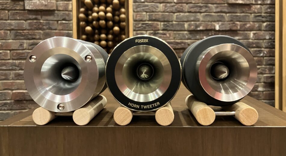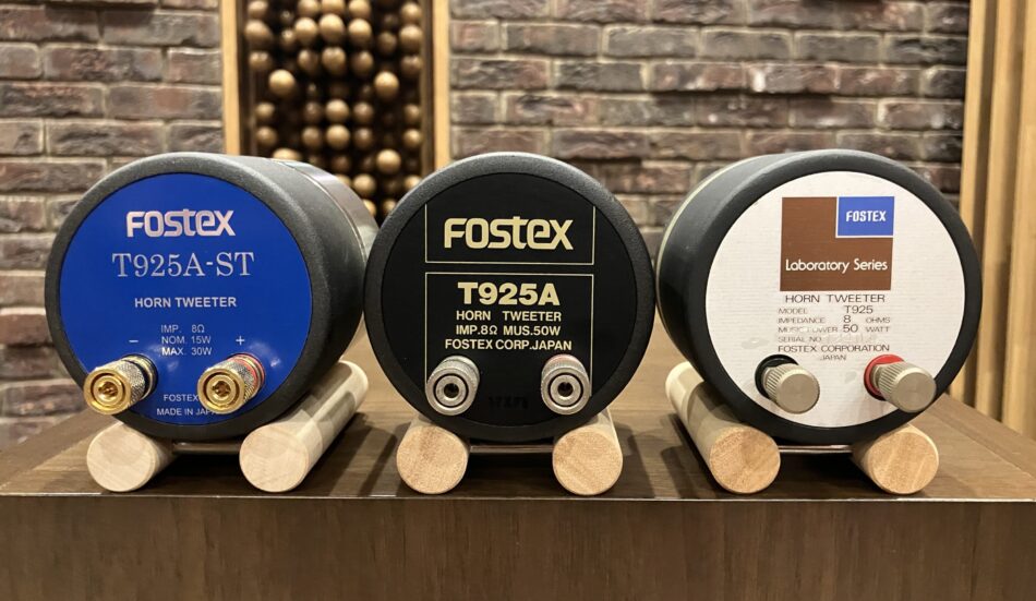 乙訓:こちらが今日聴いていただくツィーター群です。まず今日の主役、限定モデルのT925A-ST。そのベースであるレギュラー商品のT925A、それと“大先輩”のT925ですね。それから以前に試作品として作ってみたものもあります。